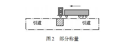 整車稱量是承載器支撐一輛車輛的整體進行稱量得到車輛總質量的稱量方式,如圖1所示,前后兩側為引道,斜線框為動態(tài)地磅的承載器,能夠同時支撐車輛的整體。部分稱量是在同一承載器上對一整輛車進行兩次或兩次以上的稱量,稱量后可將每部分(如軸載荷)稱量結果相加,得到車輛總質量的稱量方式,如圖2所示,承載器只能同時支撐車輛的一個軸。