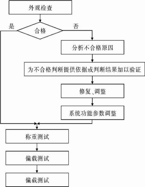 地磅經(jīng)過(guò)一段時(shí)間的使用,出現(xiàn)偏差是正常的。引發(fā)汽車衡偏載超差的原因有多種,有時(shí)甚至幾個(gè)原因同時(shí)出現(xiàn)。在現(xiàn)場(chǎng)調(diào)試時(shí),一般應(yīng)遵循以下步驟,采用多種方法分析超差原因,利用角差公式詳細(xì)排查調(diào)試環(huán)節(jié),偏差即可解決,附調(diào)試步驟圖(見(jiàn)圖3)。